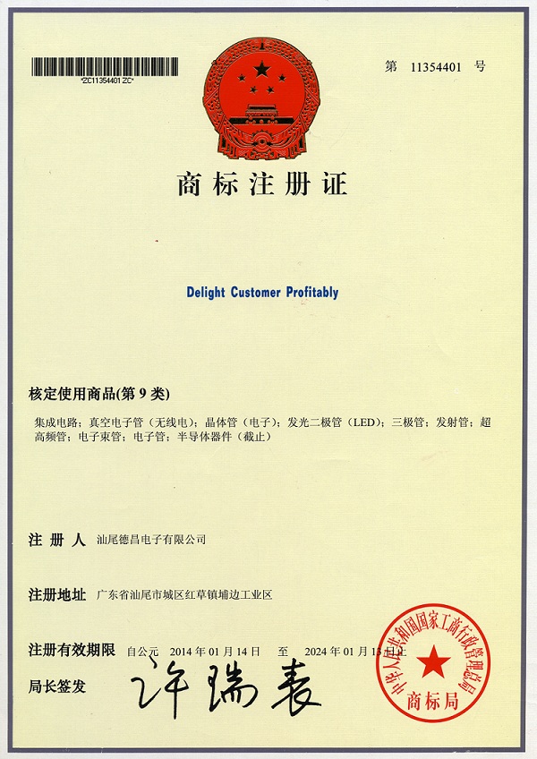 是汕尾德昌電子有限公司在中國的注冊商標(biāo)之一,受法律保護(hù),侵權(quán)必究。 未經(jīng)汕尾德昌電子有限公司書面許可,任何單位和個(gè)人不得以任何方式或理由對該商標(biāo)